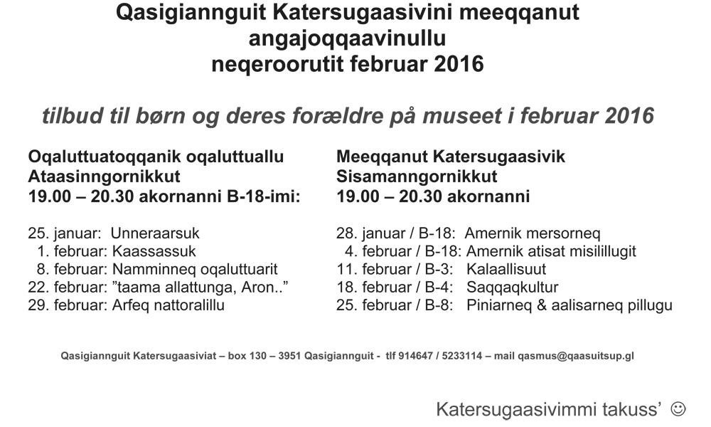 Qasigiannguit Katersugaasivini meeqqanut angajoqqaavinullu neqeroorutit februar 2016