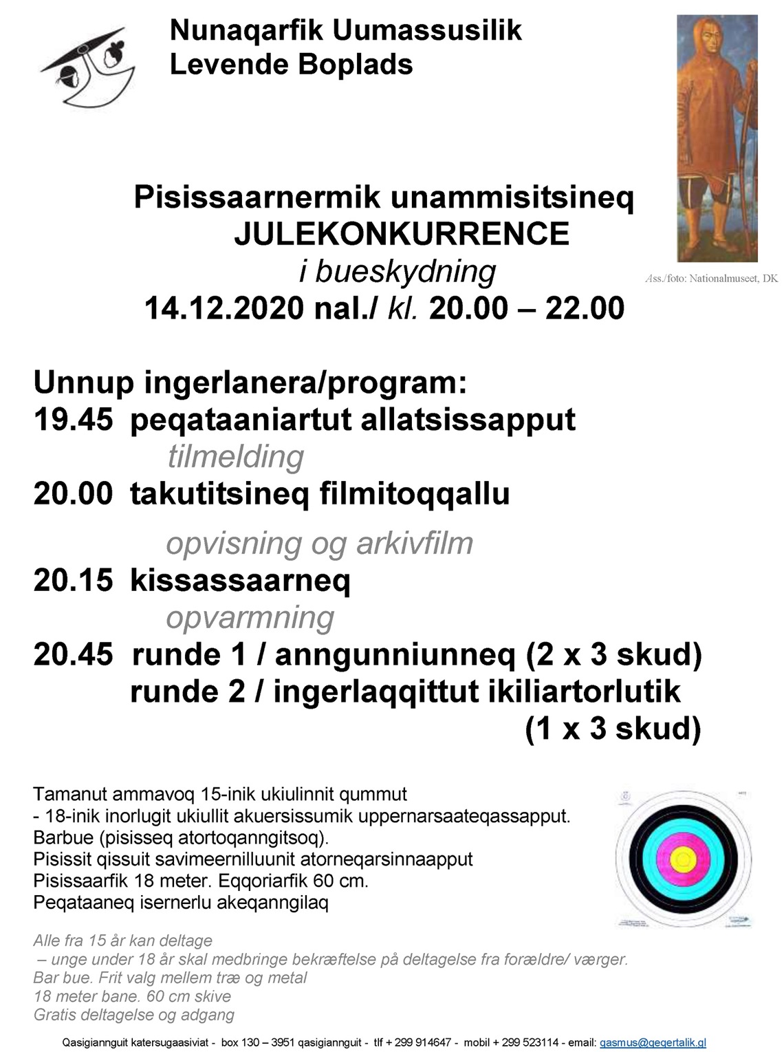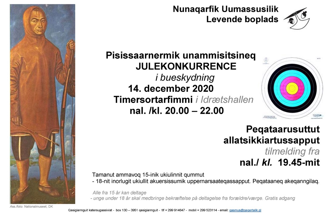 Under Levende Boplads, Qasigiannguit Museum arrangerer støttegruppen AARNUAT’s bueafdeling juleturnering i bueskydning i Idrætshallen mandag 14.12.2020 kl. 20.00 – 22.00
