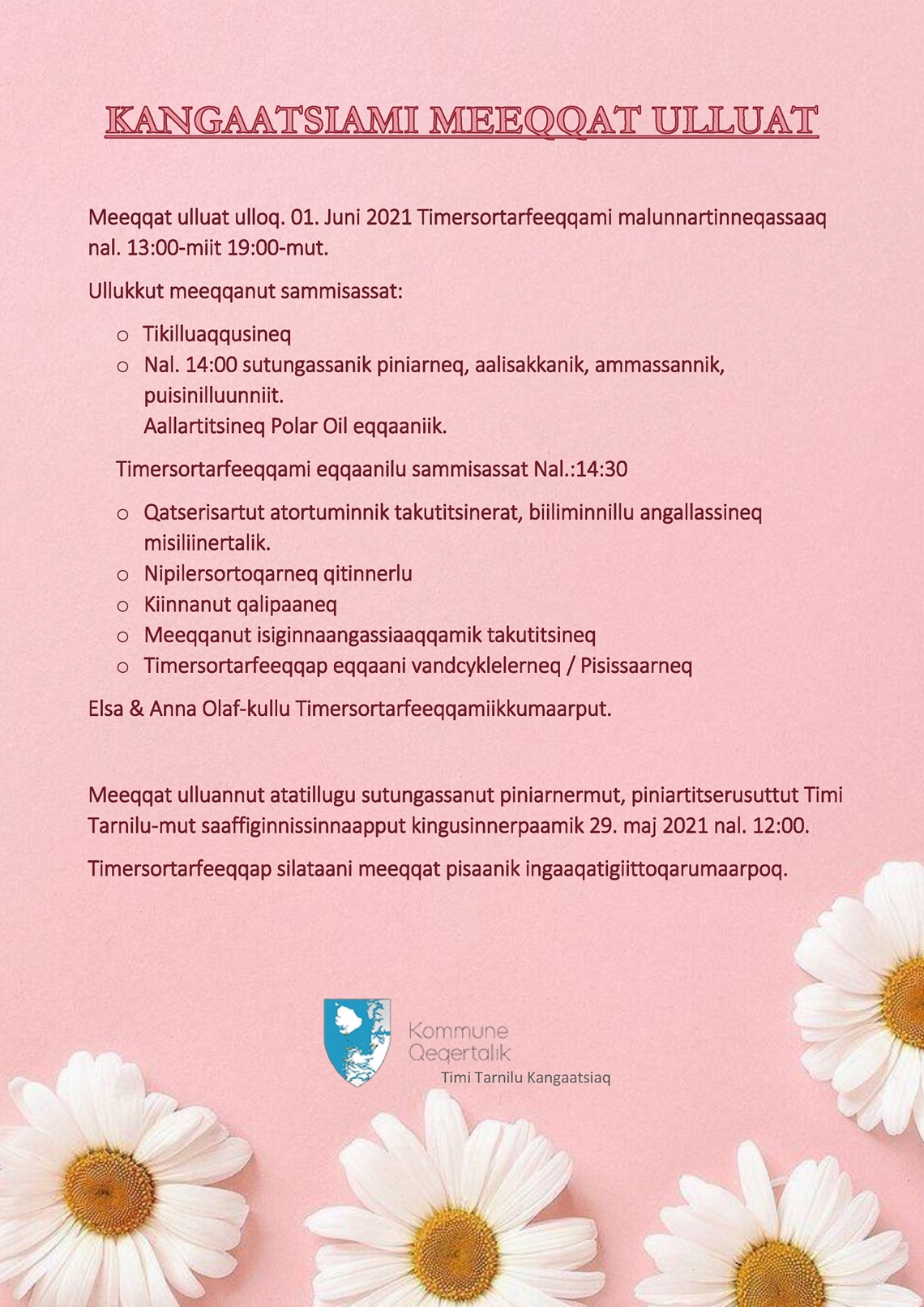 Kangaatsiap atuarfia nunaqarfinnilu eqqaanilu atuarfiit nal. 10.00 pisuttuaqatigeeriarluta atuarfiup skolegårdiani nuannisaaqatigiissuugut sutugassaqalaarluta.