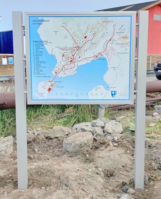 Nu er blevet sat den første store byskilte op ved havnen. Der kommer til at sat skilte op ved heliport og midtbyen i løbet af måneden.