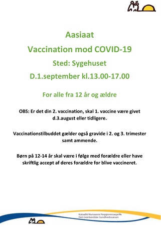 Tilbud til at blive vaccineret mod COVID-19 i Aasiaat den 1. september 2021.