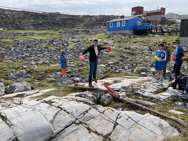 Disc Golf er den nyeste sportsgren i hele verden. Da vi kom til indvielsesstedet var der varmt luft, næsten svimlende. Til indvielsen deltog bl.a. håndværkere, Aasiaat VVS, som var frivillige til at sætte udstyre op, embedsmænd fra kommunen, projektansvarlig Philip Jensen, 2 Danmarks Disc Golf mestre og ikke mindst flere drenge, der var ivrige til at prøve banen.