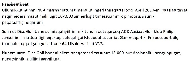 Disc Golf nunarsuaq tamakkerlugu timersuutitut nutaanerpaatut oqaatigineqarsinnaavoq.