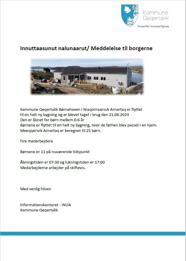 Børnehaven i Niaqornaarsuk Arnartaq er blevet taget i brug d. 21.08.2023