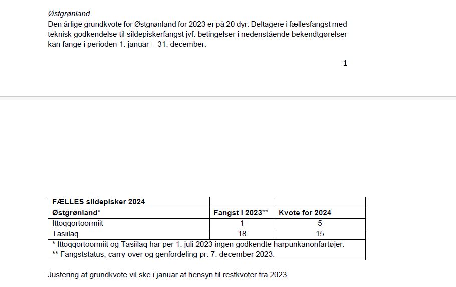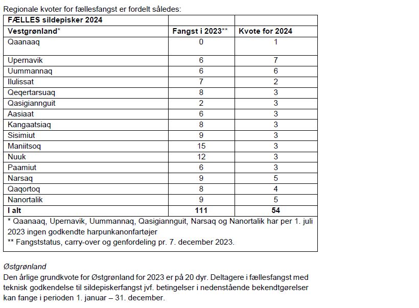 Den årlige grundkvote for sildepiskere i Vestgrønland er på 164 dyr. Kvoten fordeles med 110 dyr til harpunkanonfartøjer og 54 dyr til fællesfangst.