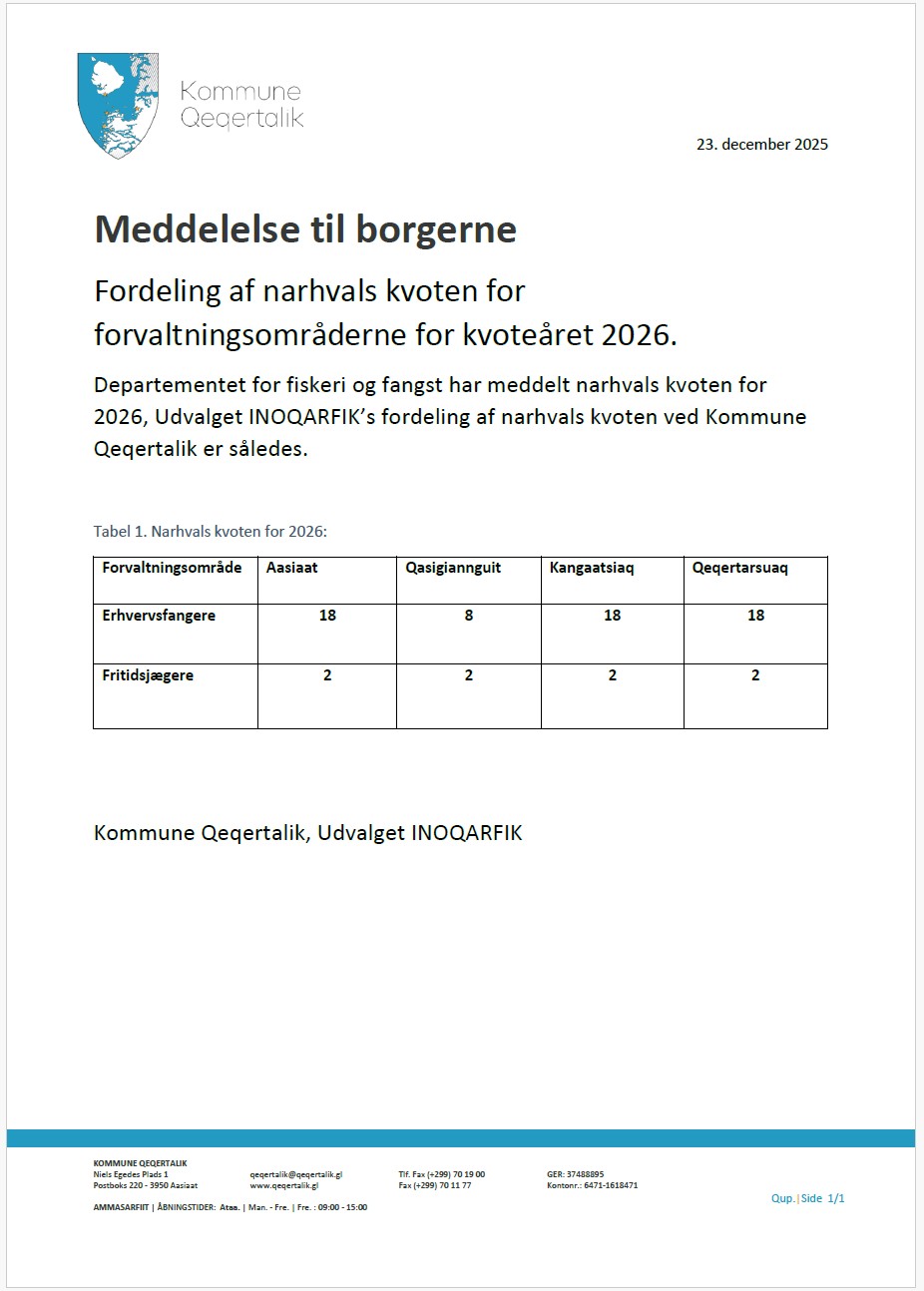 Fordeling af narhvals kvoten for forvaltningsområderne for kvoteåret 2026.