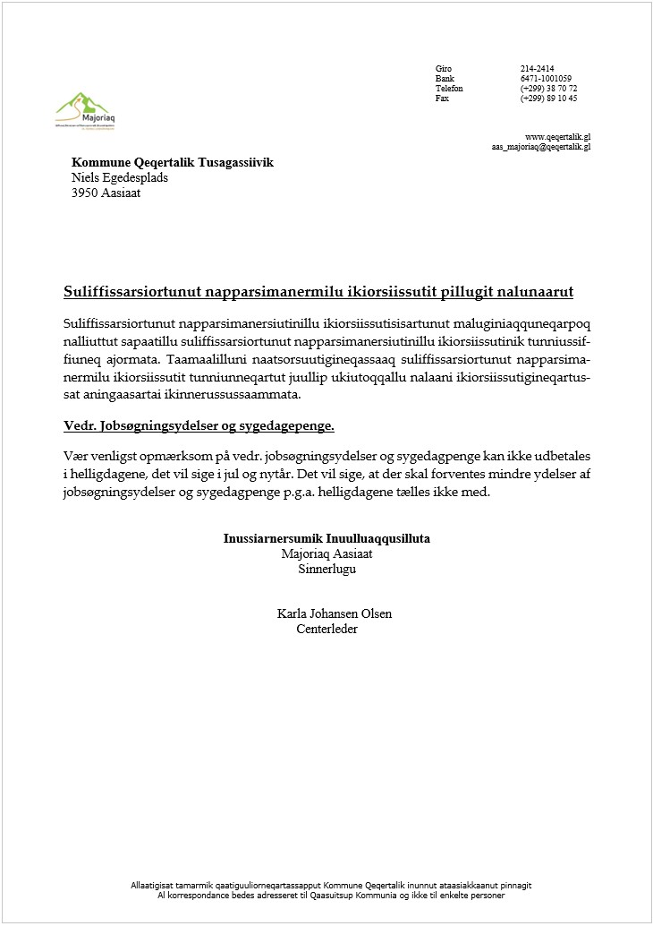 Vær venligst opmærksom på vedr. jobsøgningsydelser og sygedagpenge kan ikke udbetales i helligdagene, det vil sige i jul og nytår.